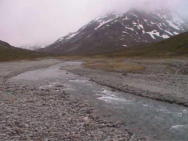 alles grau in grau. Es regnet. Die Wolken hängen im Tal. Start in Sjoa bei Regen.