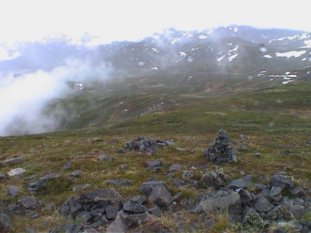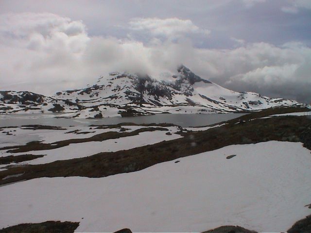 Halbe Strecke nach Lom - trocken. RV 55, ab Roisheim rauf zu den Spiterstulen, 18 km nasse Schotterstrecke, 1100 m Höhe.